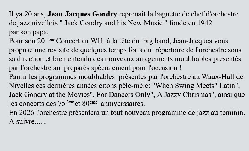 Pour son 20 Concert au WH à la tête du big band, Jean-Jacques vous propose une revisite de quelques temps forts du répertoire de l'orchestre sous sa direction et bien entendu des nouveaux arragements inoubliables présentés par l'orchestre au préparés spécialement pour l'occasion !