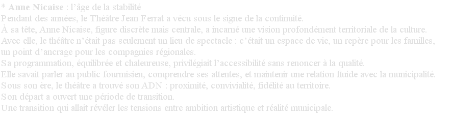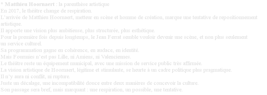 Comment une salle municipale de Fourmies s’est réinventée au fil de trois directions et trois visions culturelles.