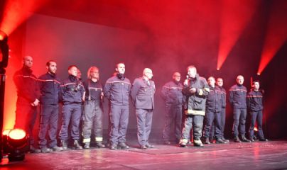 Aux côtés des pompiers qu'il a invités sur la scène du théâtre